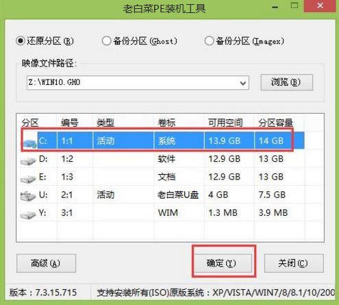 2、进入老白菜pe界面后,在弹出的“老白菜PE装机工具”中选择ghost win10系统安装包,接着选择系统盘,点击“确定”,如图所示: