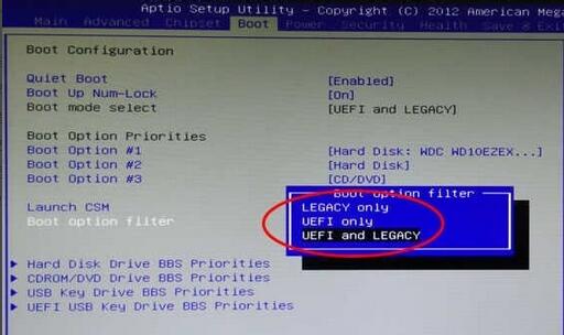 4.接着会弹出一个小窗口,可以看到有LEGACY only、UEFI only、UEFI and LEGACY三种选项,根据自己的需要选择启动选项,若是单一的UEFI启动环境,选择“UEFI only”即可;若想支持UEFI,又想支持传统BIOS启动,选择“UEFI and LEGACY”即可。