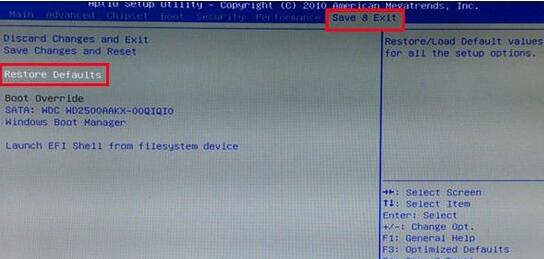 2.接着切换到“Save & Exit”选项,移动上下方向键选择“Restore Defaults”按回车。