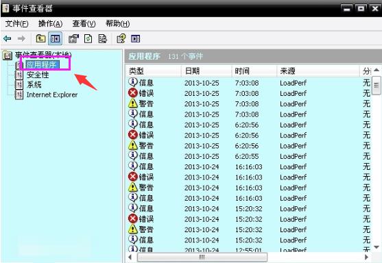 6,可以在开始→运行中输入:EventVwr.msc,回车后打开事件查看器,注意检查其中的系统日志和应用程序日志中标明错误的项。如图所示: