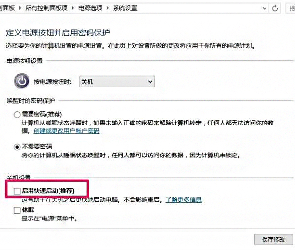 7、设置了能够顺利关机后,再开机,在系统设置窗口,左键点击启用快速启动,在前面小方框内打上勾(不影响关机),再点击保存修改即可。如图所示:
