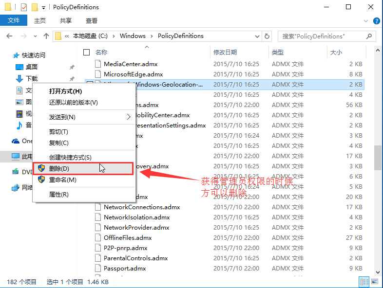2.右键点击删除Microsoft-Windows-Geolocation-WLPAdm.admx文件(在删除之前用户们必须先获得管理员最高权限,详情请参考:win10专业版如何获得最高管理员权限)。如下图所示