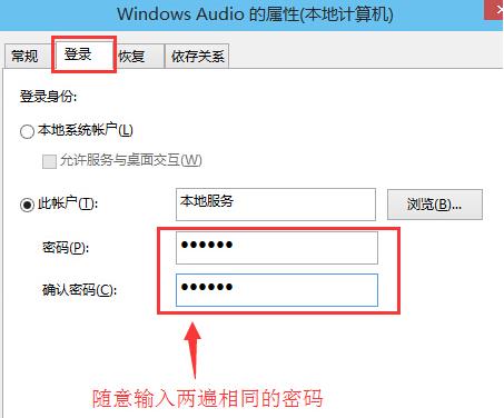 5、还是在Windows Audio的属性窗口中,点击切换到“登录”项,然后修改此账户的密码,任意输入两遍相同的密码即可(如:123456)点击“确定”进入下一步操作。如图所示: