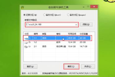 2、进入老白菜pe界面后,会自动弹出“老白菜PE装机工具”,我们在下拉菜单中选择ghost win10系统安装包,接着选择系统盘,点击“确定”,如图所示: