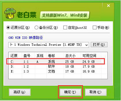 4.回到老白菜PE装机工具,点击选择一个安装win10系统的磁盘,然后点击“确定”。