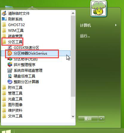 2.接着在老白菜pe桌面,依次点击“开始菜单 - 分区工具 - 分区神器DiskGenius”。如下图所示