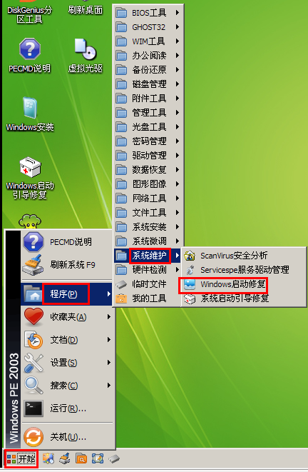 2.单击左下角开始菜单,依次进入“程序” — “系统维护” — “windows启动修复”