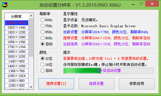 5.如果用户们不懂的如何设定屏幕分辨率、刷新率、颜色多少的话,可以点击“推荐设置”让系统自动选择适合屏幕的屏幕分辨率。如下图所示
