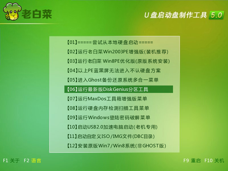 1、首先,将制作好的老白菜启动盘插入usb接口(台式用户建议插在主机机箱后置的usb接口),然后使用一键u盘启动快捷键或者启动项引导设置进入到老白菜主菜单界面,选择【06】运行最新版diskgenius分区工具;如下图所示: