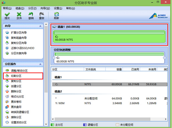 5.分区创建完成,选中刚才新建的分区,点击分区操作下面的“切割分区”如下图所示
